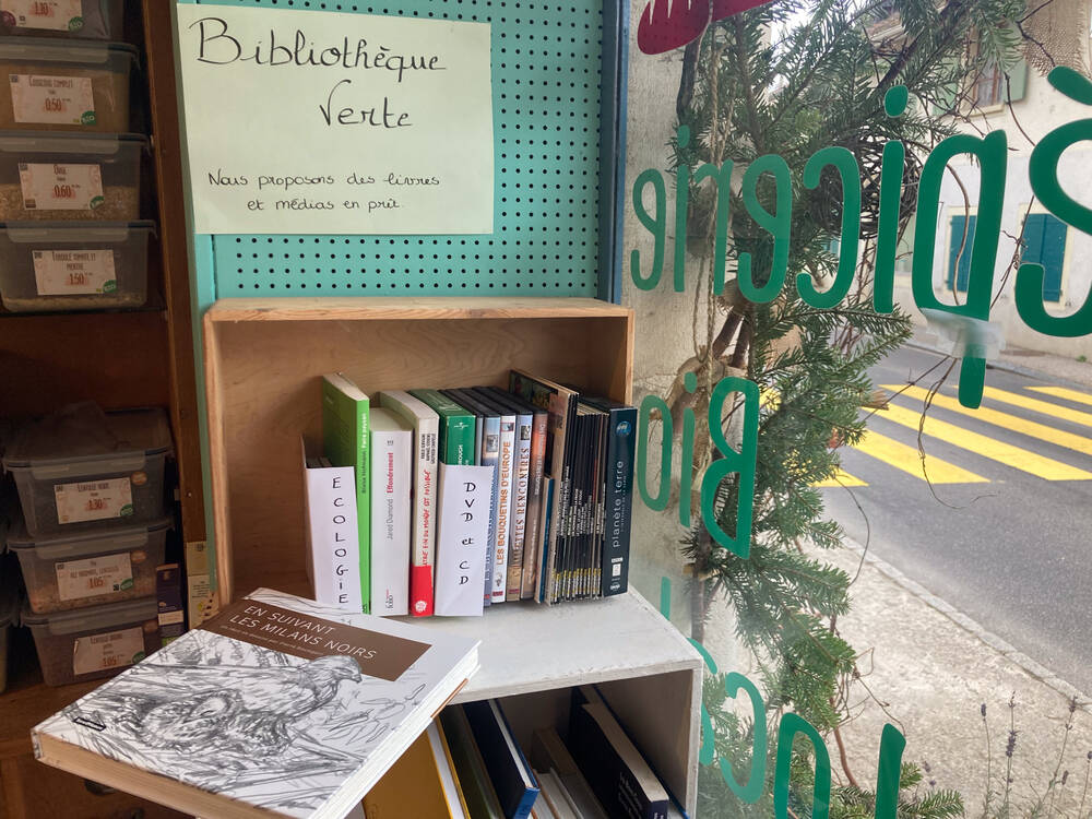 Quelque peu éclipsée par la vitrine de Noël, notre "Bibliothèque verte" a repris sa place à l'entrée de l'épicerie. Mais pourquoi une bibliothèque dans une épicerie ?