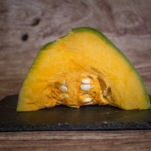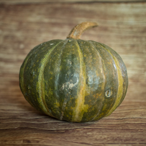 Courge aux fruits de couleur ivoire striés de vert qui vire à l'orange. La chair de la courge patidou est orangée, très fine, ferme, sucrée, au délicieux goût de noisette. Elle est aussi décorative que succulente.