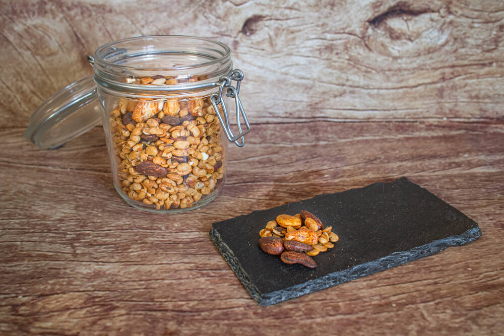 Mélange de graines de soja, amandes et noix de cajou, grillées au tamari. Haute teneur en protéine (30g pour 100g).